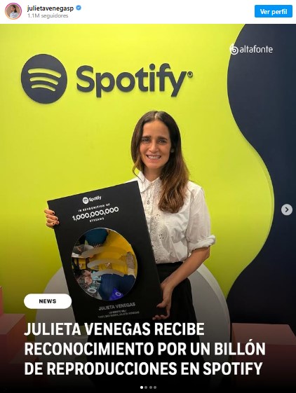 La cantante mexicana, Julieta Venegas ha marcado un nuevo logro en su carrera. Y es que la tarde del 6 de octubre se le informó que se convirtió en la primera artista nacional en generar mil millones de streams en una de sus canciones en la plataforma Spotify.