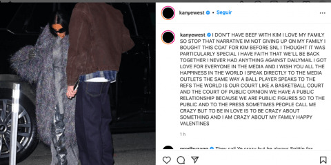 El rapero le envió un mensaje del Día de los Enamorados a Kim Kardashian, y es que indicó que busca de vuelta a su familia, por lo que al parecer quiere regresar con Kim Kardashian.