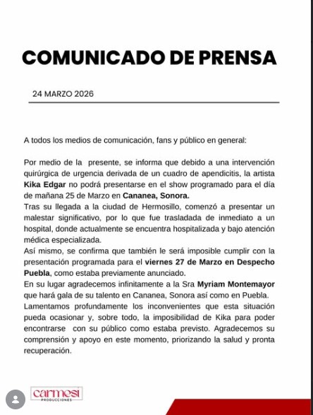 Kika Edgar fue hospitalizada de emergencia en Sonora tras presentar complicaciones de salud, informaron familiares de la actriz.