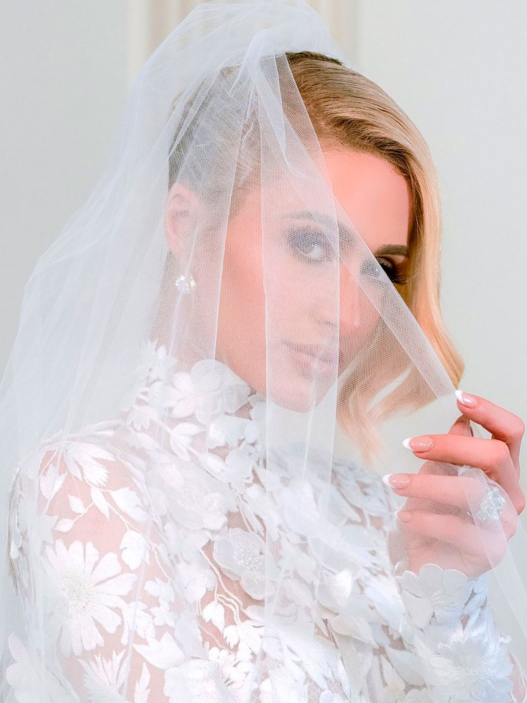Cabe mencionar que la empresaria compartió la primera imagen con uno de sus 10 vestidos de novia que usó en su enlace matrimonial, en la imagen se puede ver a Paris con un vestido con manga larga, cuello alto, con encaje, transparencias y un vuelo creado por Óscar de la Renta.