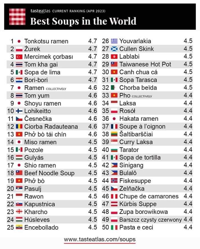 El portal Taste Atlas publicó un ranking de “Mejores Sopas del Mundo” en donde votaron diversas personas de varios países para llegar a la conclusión de cuál es la mejor sopa del mundo.