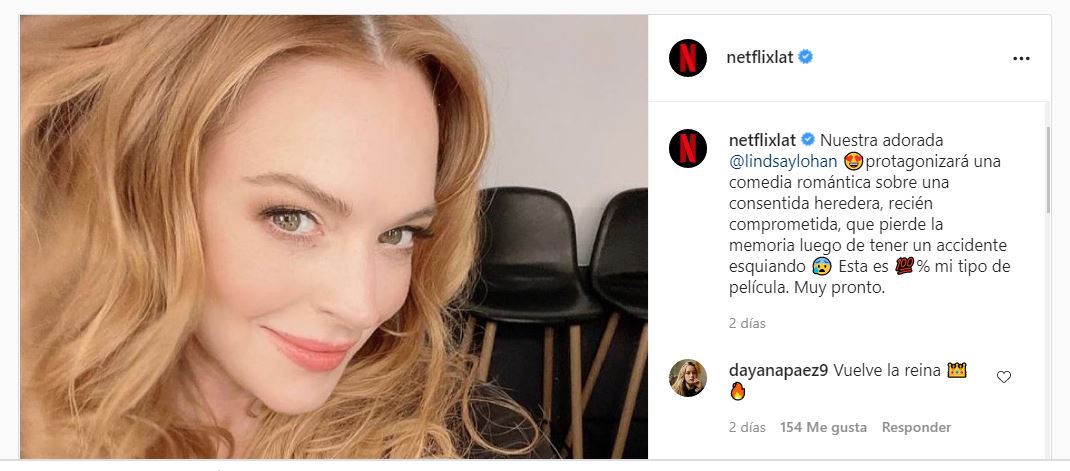 «Nuestra adorada Lindsay Lohan protagonizará una comedia romántica sobre una consentida heredera, recién comprometida, que pierde la memoria luego de tener un accidente esquiando. Esta es 100% mi tipo de película. Muy pronto», escribió en Instagram la cuenta oficial de Netflix Latinoamérica.