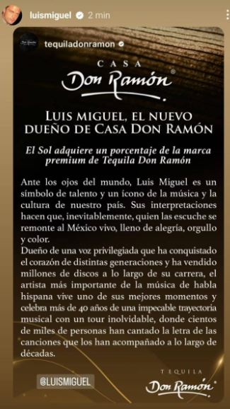 Según un comunicado que el propio artista compartió en sus redes sociales, Luis Miguel se ha unido a Casa Don Ramón, una empresa 100 por ciento mexicana que se dedica a la producción y comercialización de tequilas de alta calidad.