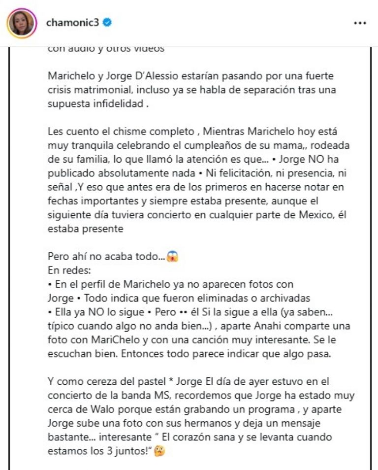 «El matrimonio entre Marichelo y Jorge D’Alessio estaría atravesando una fuerte crisis por una infidelidad. Se cree que ya están separados», informó la comunicadora a través de sus redes.