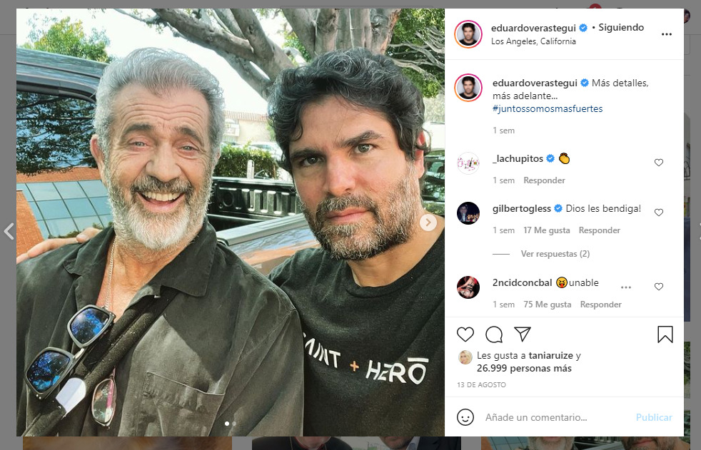 Junto al anuncio, Eduardo Verástegui compartió una fotografía en la que aparece acompañado por el actor estadunidense . Sin embargo, los conductores de Sale el Sol señalaron que el actor recibió críticas por su trabajo con Mel Gibson.