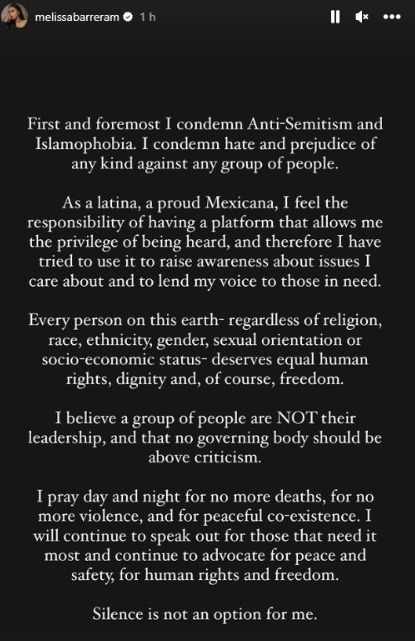 Y es que la actriz se pronunció en redes sociales, condenando cualquier forma de antisemitismo e islamofobia, así como los prejuicios contra cualquier grupo social.