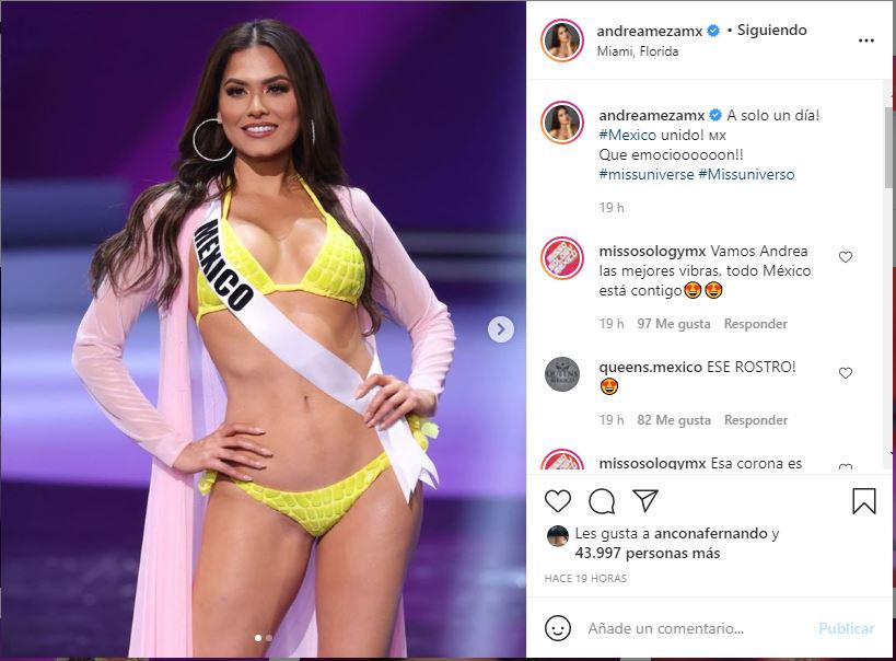 En el listado elaborado por E! Latino, la modelo mexicana de 26 años Andrea Meza aparece como favorita. Con experiencia en los concursos de belleza, ya que participó en Miss Mundo en 2017, tiene la oportunidad de colocar en el podio a su país esta edición.