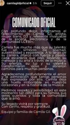 En el mensaje, sus seres queridos la recordaron como «un referente invaluable de la escena electrónica y de la comunidad LGBT+», destacando no solo su talento, sino su capacidad de inspirar con su autenticidad y valentía.