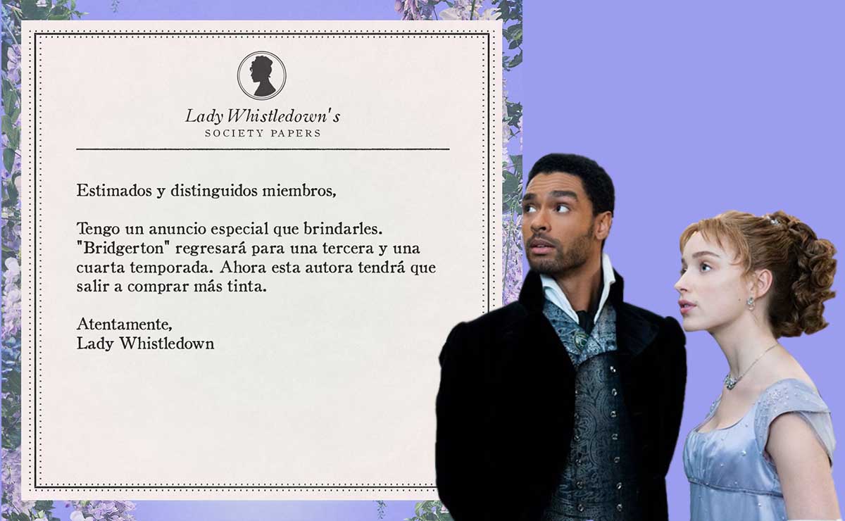 “Estimados y distinguidos miembros, tengo un anuncio especial que brindarles. Bridgerton regresará para una tercera y una cuarta temporada. Ahora esta autora tendrá que salir a comprar más tinta”, se lee en el comunicado.