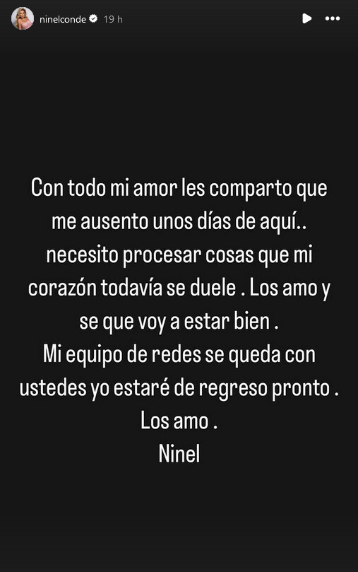 “Con todo mi amor les comparto que me ausento unos días de aquí… necesito procesar cosas que mi corazón todavía se duele. Los amo y sé que voy a estar bien. Mi equipo de redes se queda con ustedes, yo estaré de regreso pronto. Los amo. Ninel”.