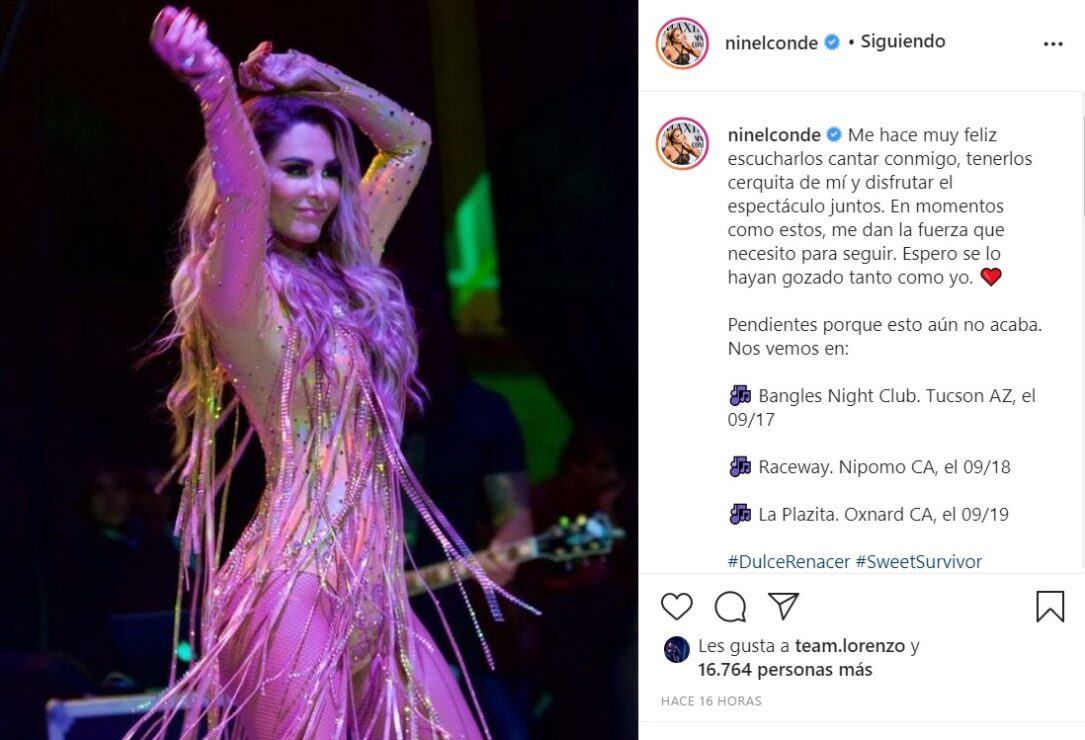 “Dios me permite volver a los escenarios en estos momentos que si bien estoy rota por dentro y por fuera… me permite sanar y sacar toooooodo en estos shows que serán inolvidables. No quiero imaginar lo que serán estos shows. ¡Si lloro me pasa un tequila! ¡Los espero y los amo!”, se lee en el mensaje de Ninel Conde.