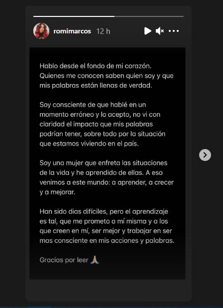 “Hablo desde el fondo de mi corazón. Quienes me conocen saben quién soy y que mis palabras están llenas de verdad, Soy consciente de que hablé en un momento erróneo y lo acepto,, no vi con claridad el impacto que mis palabras podrían tener sobre todo por la situación que vivimos en el país”, dice el mensaje.
