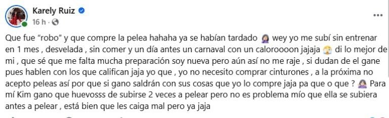 Tras varias horas de silencio, Karely Ruiz utilizó su cuenta de Facebook para enfrentar las críticas de quienes aseguran que el combate estuvo arreglado. Con su característico estilo directo, la influencer desmintió haber «comprado» a los jueces y detalló las dificultades que enfrentó para cumplir con el compromiso.