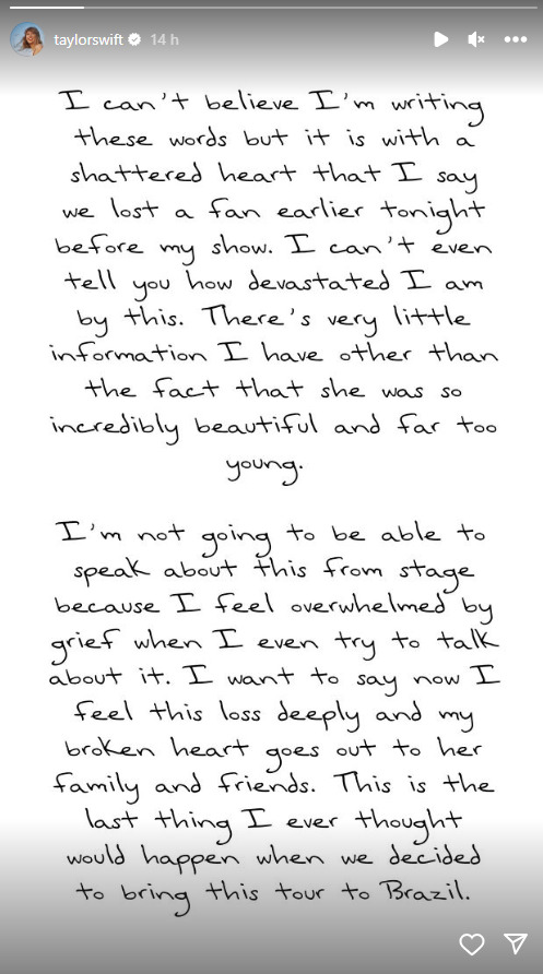 «Estoy muy triste por la pérdida de una hermosa joven que vino a verme anoche. Mi corazón está con su familia y sus amigos. Les envío todo mi amor», escribió Taylor Swift en su cuenta de Twitter.