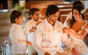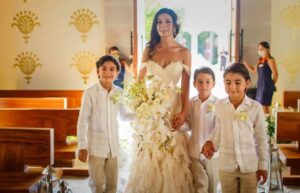 Además, en el video se ve a la familia en la capilla donde sólo los acompaña el padre y un músico. Los pequeños hijos de la pareja son los encargados de ponerles el lazo y acompañarlos mientras se ponen el anillo.