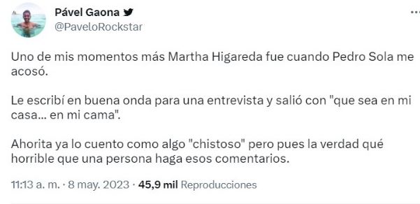 En su cuenta de twitter el escritor indicó en una publicación donde usuarios compartían historias que parecían mentira pero son verdad, que Pedro Sola lo acosó pues según el periodista, “Le escribí, en buena onda, para una entrevista y salió con ‘que sea en mi casa, en mi cama’”.