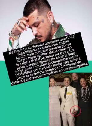 “Medios internacionales aseguran que Nodal fue obligado a casarse con Ángela Aguilar bajo contrato firmado por su suegro Pepe Aguilar, dicho contrato le exige a Nodal permanecer tres años junto a Ángela Aguilar sin haberle sido infiel, de lo contrario al comprobarse una infidelidad por parte de Nodal este deberá pagar la cuantiosa suma de 12 millones de dólares y el divorcio inmediato con Ángela Aguilar”, dice el mensaje que circula en redes.