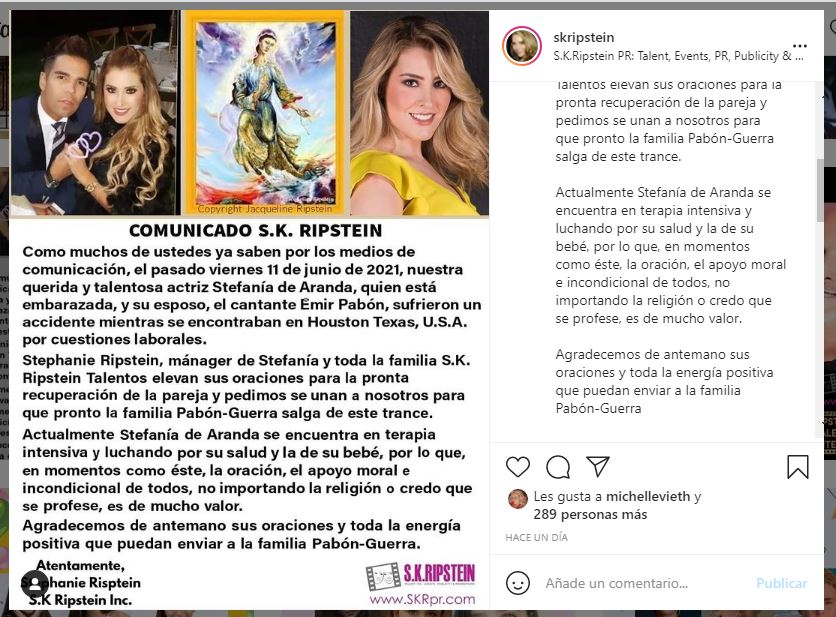«Emir ya fue dado de alta, gracias a Dios. Stefy sigue en terapia intensiva no la suelten. Actualmente Stefanía de Aranda se encuentra en terapia intensiva y luchando por su salud y la de su bebé, por lo que, en momentos como éste, la oración, el apoyo moral e incondicional de todos, no importando la religión o credo que se profese, es de mucho valor… Toda la familia elevan sus oraciones para la pronta recuperación de la pareja y pedimos se unan a nosotros para que pronto la familia Pabón-Guerra salga de este trance. Agradecemos de antemano sus oraciones y toda la energía positiva que puedan enviar”, se detalló en el documento.