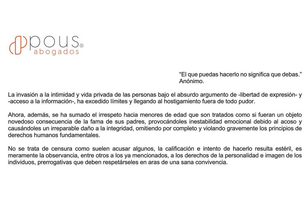 Después de la reacción que tuvo Arámbula con la prensa, su abogado Guillermo Pous, emitió un comunicado en el que destacó el derecho a la privacidad de la actriz y sus hijos, situación que no debe ser violentada por el hostigamiento.