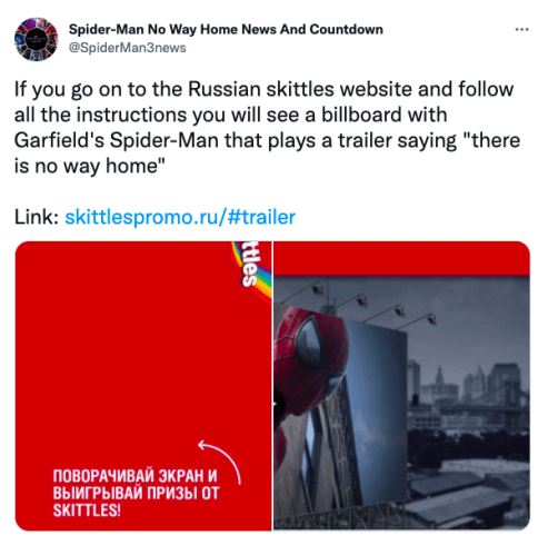 En la cuenta de Twitter Spider-Man No Way Home Neews And Countdown ha compartido imágenes en donde se observa como Skittles en Rusia mostró al superhéroe con el traje que vistió Garfield en una valla publicitaria.