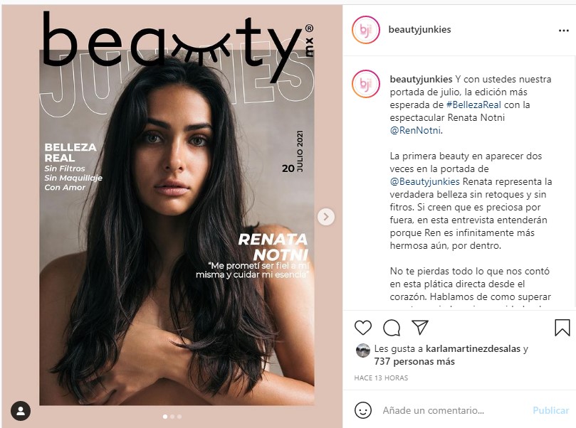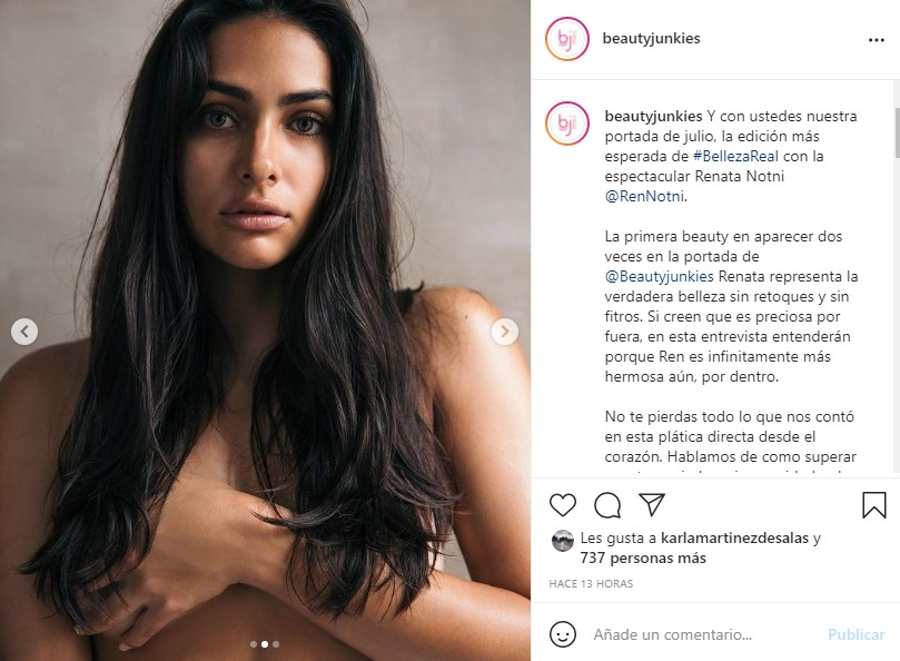 En las fotografías reveladas en redes sociales, Notni luce casi sin maquillaje y con su pelo oscuro que le cubre los senos, ya que posó sin sostén, dejando ver por debajo de la cintura únicamente sus jeans.