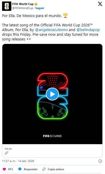 Asimismo, se confirmó que el estreno oficial de la canción será este mismo viernes. “’Por ella’ se lanza este viernes. Pre-guarda ahora y mantente atento para más lanzamientos”, indicaron en la publicación oficial. Esta noticia ha generado una enorme expectativa, ya que busca proyectar la esencia de la cultura mexicana mientras invita a la audiencia global a disfrutar de la fiesta del fútbol.