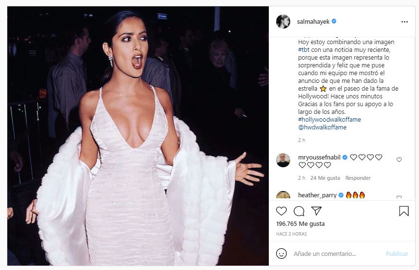 “#tbt con una noticia muy reciente, porque esta imagen representa lo sorprendida y feliz que me puse cuando mi equipo me mostró el anuncio de que me han dado la estrella en el paseo de la fama de Hollywood! Hace unos minutos. Gracias a los fans por su apoyo a lo largo de los años. #hollywoodwalkoffame @hwdwalkoffame”.