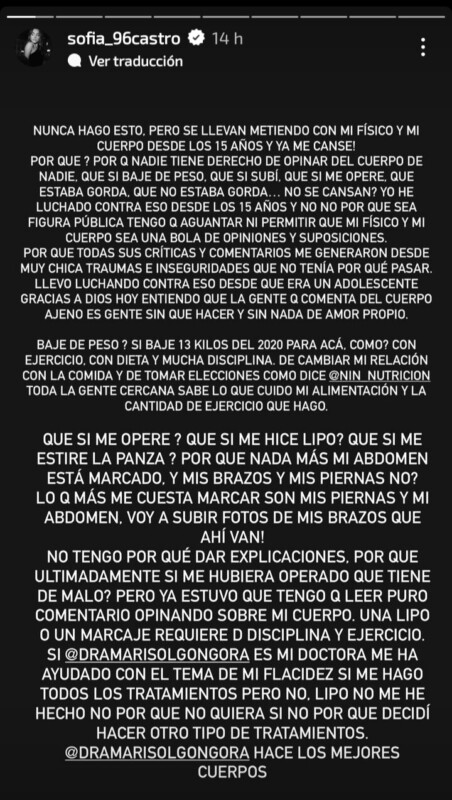 Sofía Castro se dirigió a sus seguidores y detractores por igual, diciendo: “Nunca hago esto, pero se llevan metiendo con mi físico y cuerpo desde los 15 años y ya me cansé. ¿Por qué? Porque nadie tiene derecho de opinar del cuerpo de nadie. Que si bajé de peso, que si subí, que si me operé, que estaba gorda, que no estaba gorda”. Esta declaración no solo muestra su frustración sino también el deseo de poner fin a la cultura de juzgar el cuerpo de las personas públicamente.