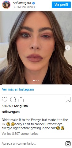 “¡No fui a los Emmy, pero sí a urgencias!”, acompañando el texto con una serie de fotografías donde se la ve recibiendo atención médica y enjuagándose el ojo afectado.