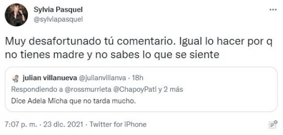 “Dice Adela Micha que no tarda mucho”, mencionaron. “Muy desafortunado tu comentario. Igual lo haces porque no tienes madre y no sabes lo que se siente”, respondió Sylvia.