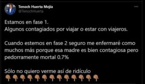 “Estamos en fase 1. Algunos contagiados por viajar o estar con viajeros. Cuando estemos en fase 2 seguro me enfermaré como muchos más porque esa madre es bien contagiosa, pero pedorramente mortal 0.7%”, se lee en el tuit de Tenoch Huerta.
