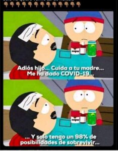 “Adiós hijo… Cuida a tu madre… Me ha dado Covid-19 y solo tengo un 98% de posibilidades de sobrevivir”, dice el hombre a su hijo en la gráfica.