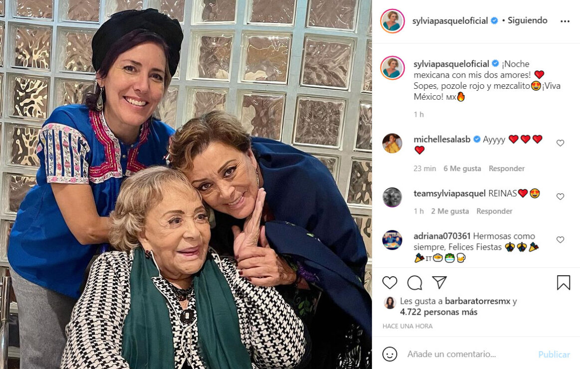 La diva del cine mexicano, Silvia Pinal, aprovechó la noche para reunirse con su hija Silvia Pasquel y su nieta Stephanie Salas. En sus redes sociales Silvia Pasquel acompañó la imagen con la siguiente leyenda: “¡Noche mexicana con mis dos amores! ❤️Sopes, pozole rojo y mezcalito😍¡Viva México! 🇲🇽🔥”.