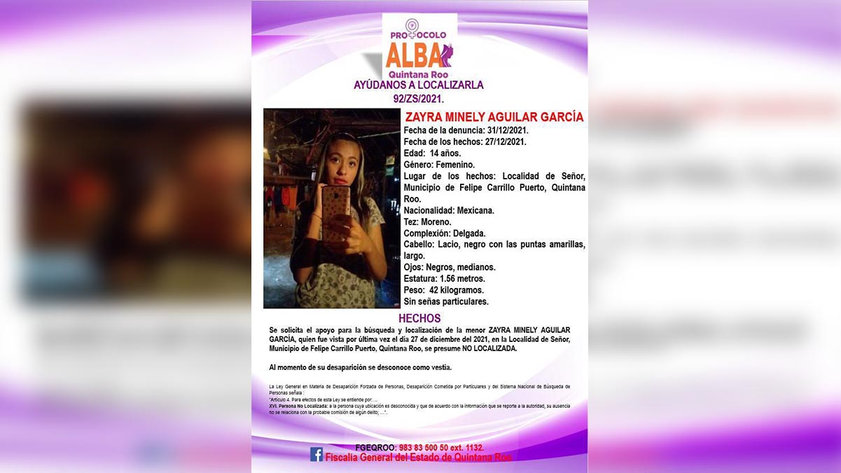 Se trata de la menor de 14 años identificada como Zayra Minely Aguilar García, quien fu vista por última vez el 27 de diciembre de 2021 en la localidad de Señor, Municipio de Felipe Carrillo Puerto, en la zona maya de Quintana Roo.