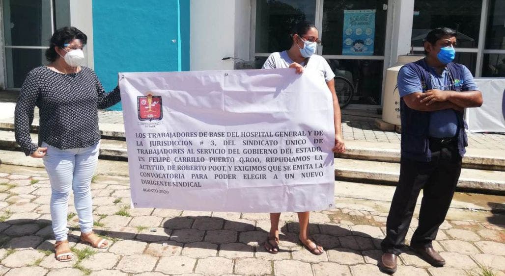 A través de pancartas, los trabajadores de la salud repudiaron al líder sindical Poot Vázquez frente al Hospital General de Felipe Carrillo Puerto, lugar en dónde señalaron las irregularidades que ha cometido como líder en detrimento de los sindicalizados.