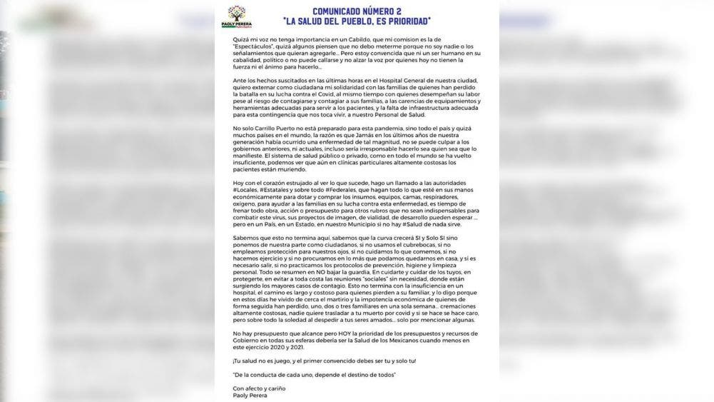 A través de un comunicado, la regidora indicó que es momento de frenar todo presupuesto para otros rubros que no sean indispensables para combatir la enfermedad que afecta a familias mayas y dotar al Hospital General de equipos, camas, oxigeno entre otras necesidades.