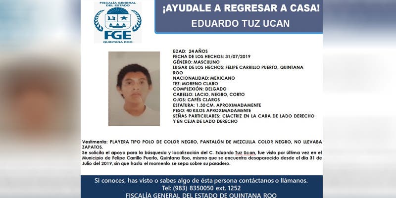 La desaparición de Eduardo Tuz Ucan ha sido notificado a la Vice Fiscalía de la zona centro, el joven padece de epilepsia, por lo que la madre pidió ayudar en su búsqueda o en dar cualquier información que de con el paradero de Eduardo.