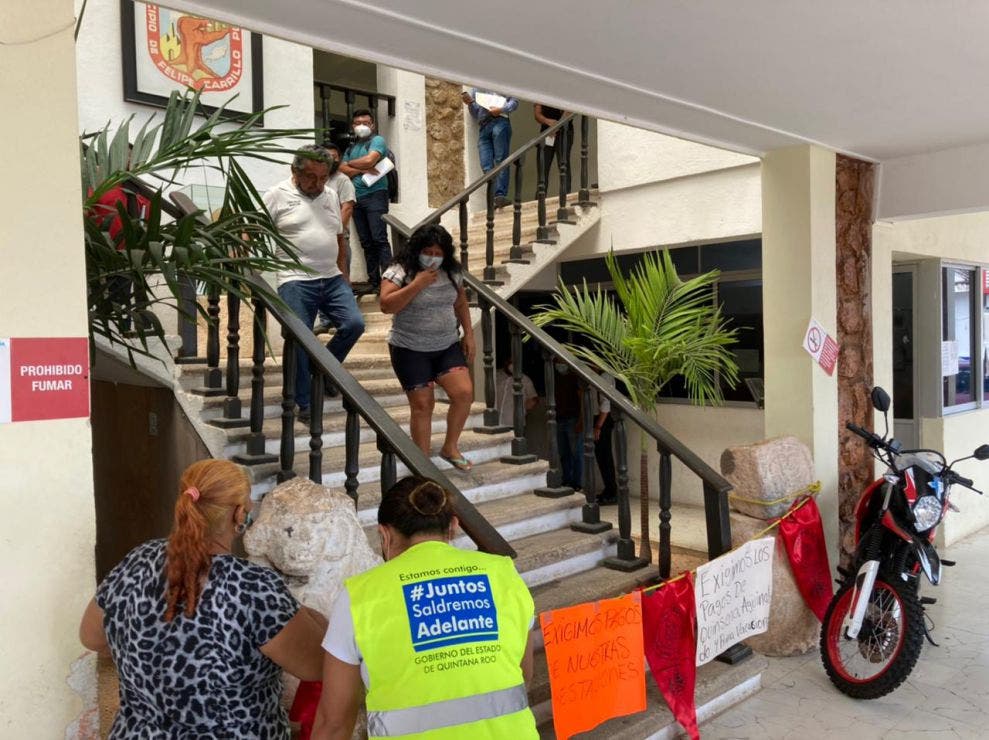 Ante la falta de respuesta del gobierno de Jose Esquivel Vargas con relación al pago de quincenas de trabajadores, que debió hacerse efectivo desde el pasado viernes, elementos de la coordinación de Protección Civil bloquearon dos accesos al palacio municipal, la entrada principal y del estacionamiento.
