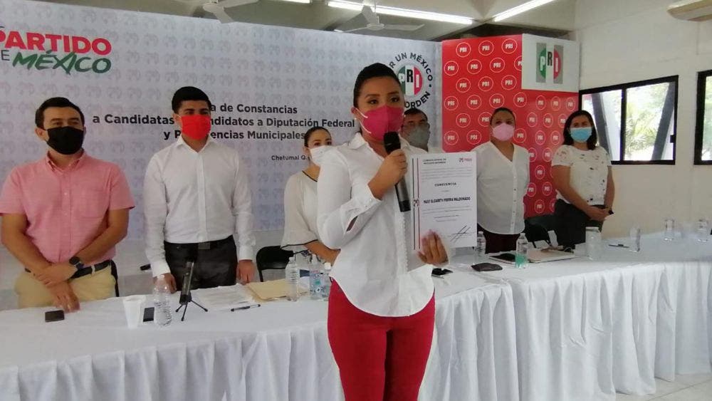 Paoly Perera Maldonado recibió este viernes la constancia que la acredita como candidata del Partido Revolucionario Institucional (PRI), para la presidencia municipal de Felipe Carrillo Puerto.