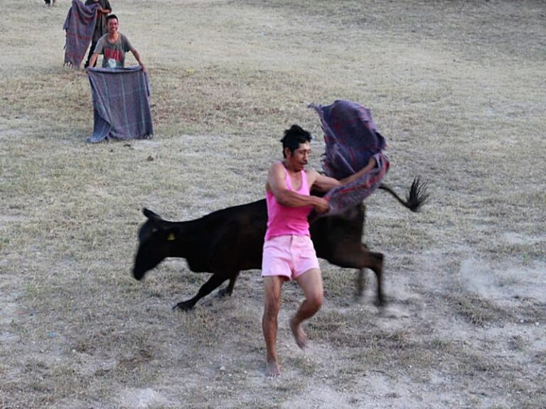 La representación que se hizo fue del ‘Baxa toro’ o ‘juego con el toro’, en la que algunos valientes se lanzaron al ruedo para demostrar su valentía frente a la bestia sin que se presentaran cornadas graves.