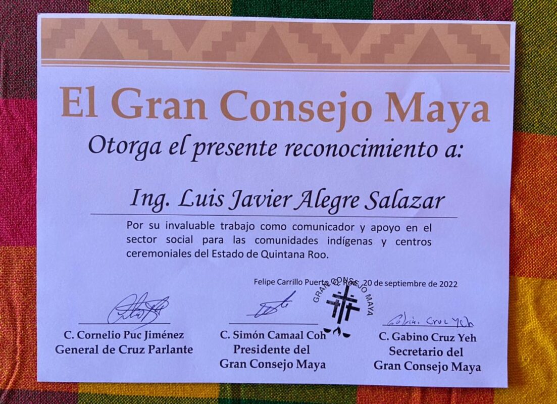 El reconocimiento da testimonio del «invaluable trabajo como comunicador y apoyo en el sector social, para las comunidades indígenas y centros ceremoniales del estado de Quintana Roo».
