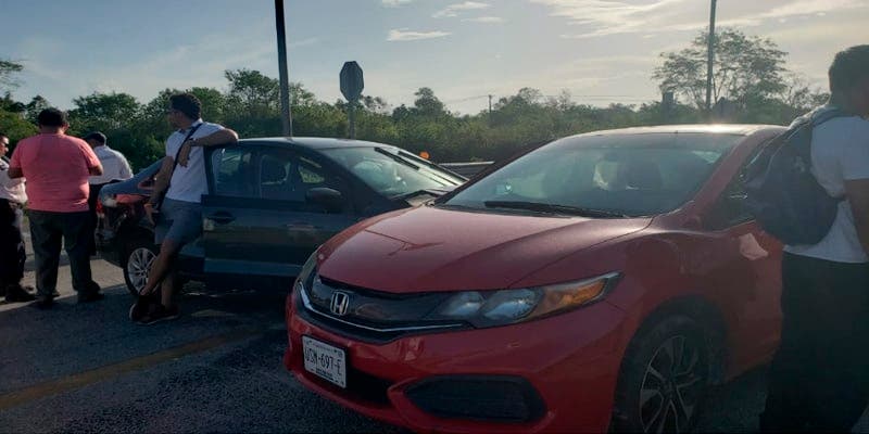 Se estrellan dos automóviles compactos en el libramiento de la salida a Chetumal, sólo se reportan daños materiales.