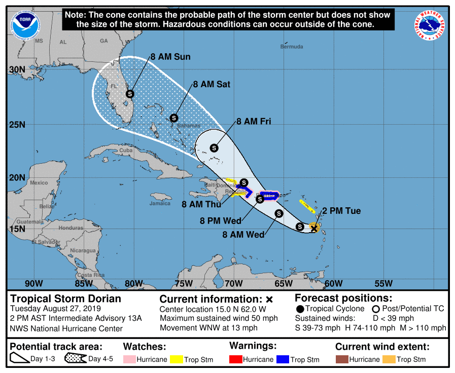El NHC emitió esta madrugada un aviso de tormenta tropical y una vigilancia de huracán ante la cercanía de Dorian, que según las últimas proyecciones pasará a unos 30 kilómetros del suroeste de Puerto Rico en su punto más cercano a la isla.