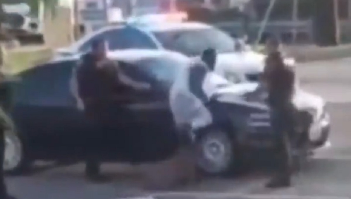 Luego que un policía separa el perro del hombre, éste parece dar un paso, pero lo hacen tropezar y el perro nuevamente azuzado por su entrenador se le abalanza sobre el hombre, esta vez mordiéndole una pierna por 30 segundos, hasta que el policía lo controla. Los agentes entonces esposan al hombre, que apenas puede caminar mientras lo llevan al vehículo de la policía.