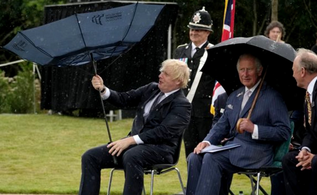 Internautas no dejaron pasar el divertido momento que vivió el primer ministro de Reino Unido, Boris Johnson; a quien compararon con el famoso comediante Mr. Bean al protagonizar una duro duelo con su paraguas en el intento por no mojarse con las gotas de lluvia que comenzaron a caer en la ceremonia oficial del Memorial en honor a policías caídos en servicio donde estuvo presente el príncipe Carlos o la ministra del Interior, Pritti Pattel, en el condado inglés de Staffordshire.
