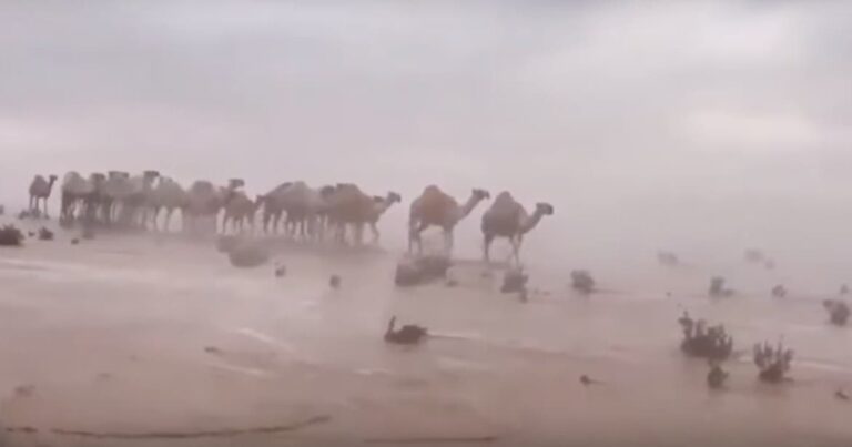 La lluvia no solo ocasionó severos estragos en la superficie del desierto sino también en los camellos, los cuales debido a lo inusual del fenómeno estaban realmente alterados, mientras uno de sus cuidadores trataba de controlarlos para luego llevarlos a un lugar donde los pudieran cubrir del agua.