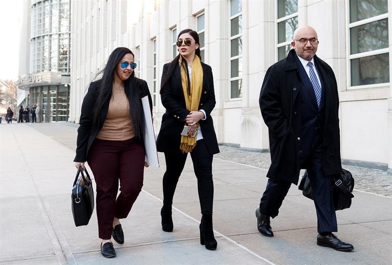 La esposa de Joaquín «Chapo» Guzmán, Emma Coronel Aispuro (i), y el abogado Angel Eduardo Balarezo (d) salen del Tribunal Federal de los Estados Unidos después del primer día de deliberaciones.