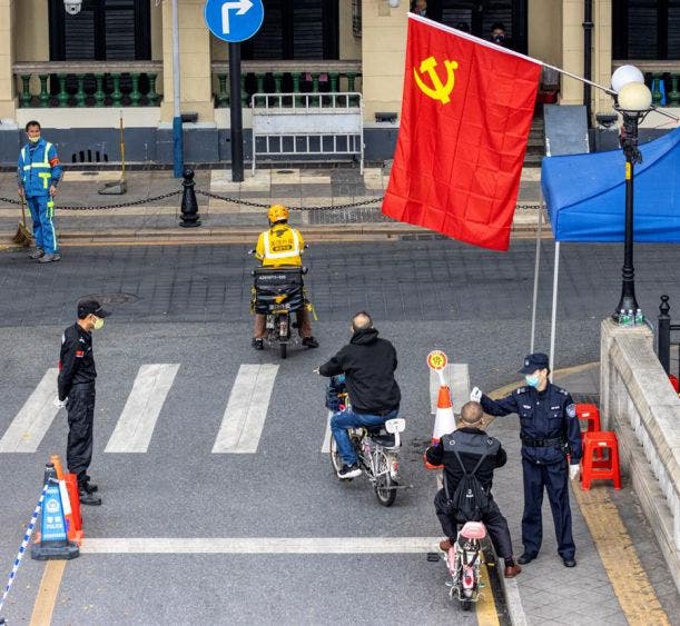 Guardias de seguridad comprueban la temperatura corporal de las personas que pasan por el bloqueo de la carretera en Guangzhou, provincia de Guangdong, China.