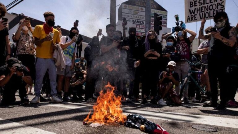Ciudadanos con gritos y pancartas se reunieron este sábado en el Parque Pan Pacific para vandalizar, realizar pintas y quemar vehículos, lo que generó un enfrentamiento con la policía de Los Ángeles, la cual chocó contra algunos manifestantes que subieron a edificios y los vandalizaron.