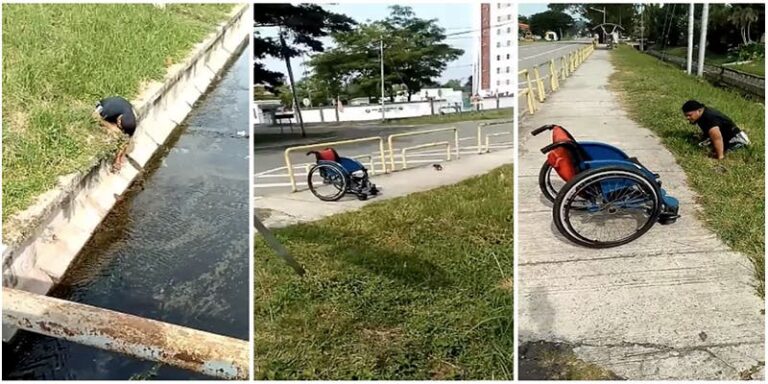 Deportista paralímpico deja su silla de ruedas para rescatar a un gatito.- A través de las redes sociales ha surgido un nuevo héroe desde Malasia; se trata de un deportista paralímpico que bajó de su silla de ruedas para recatar a un gatito.